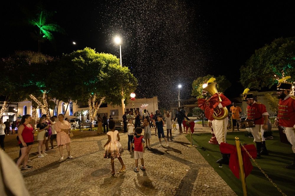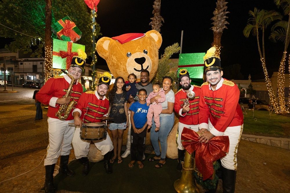 A programação trouxe também a apresentação especial do Coral Encantar, que emocionou o público com canções natalinas, tornando o momento ainda mais simbólico e cheio de sentimento. As crianças puderam aproveitar a Parada Natalina, com a presença de duendes, personagens temáticos e, claro, o convidado mais esperado da noite: Papai Noel, que arrancou sorrisos e fotos de todos os cantos da praça.
